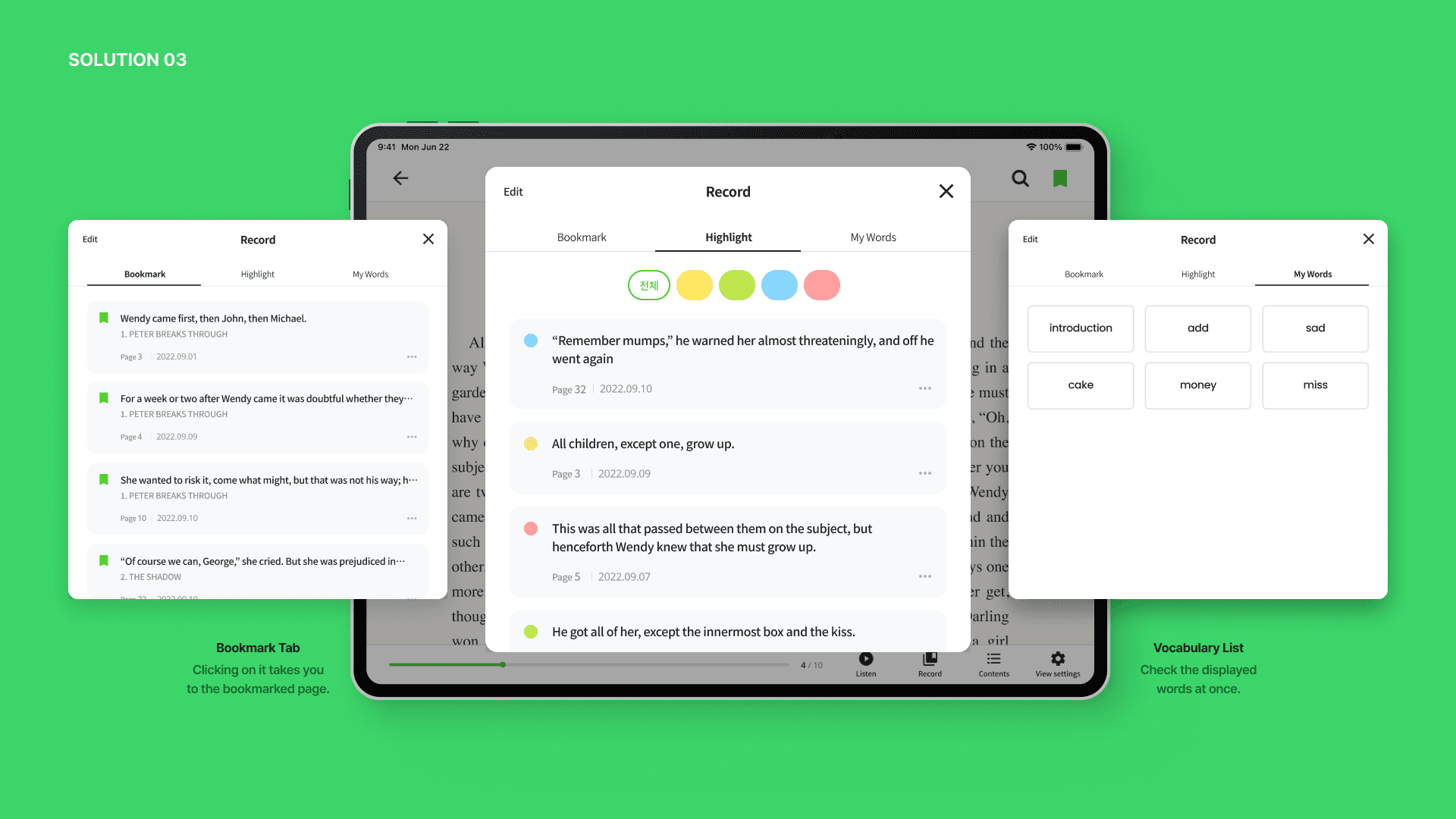 Through bookmark, highlight, and vocabulary list features in the record, users can easily review and effectively read books by checking important contents anytime.