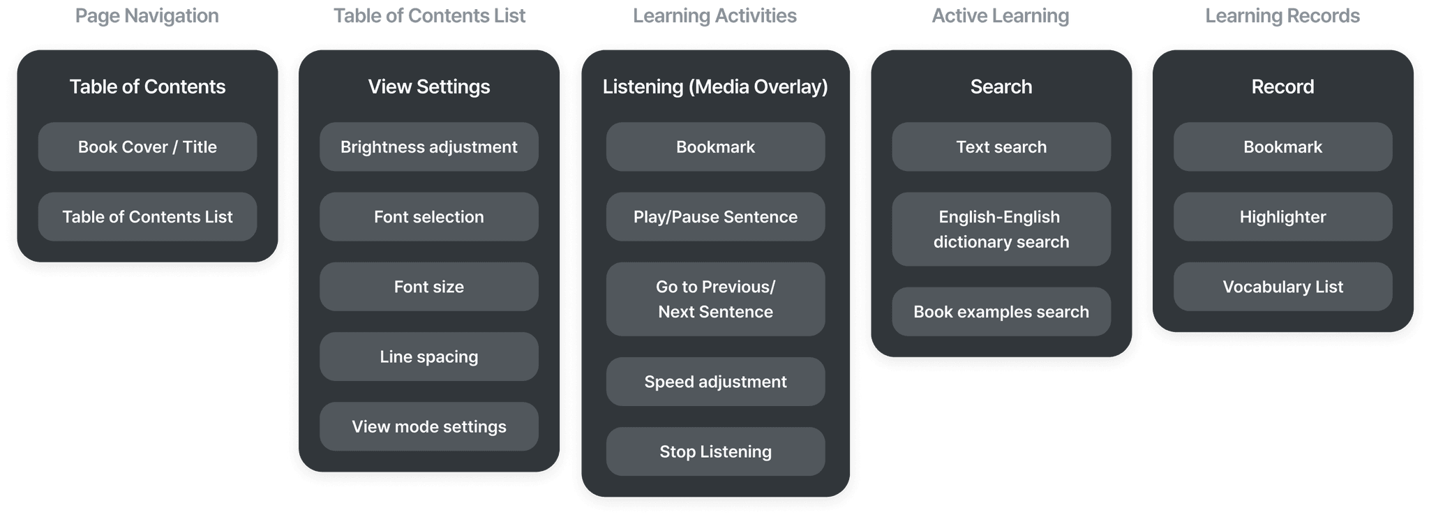 Based on the insights gained through research and interviews, we identified and organized the features for the Reading and EPUB Viewer functions of the Bookio platform.