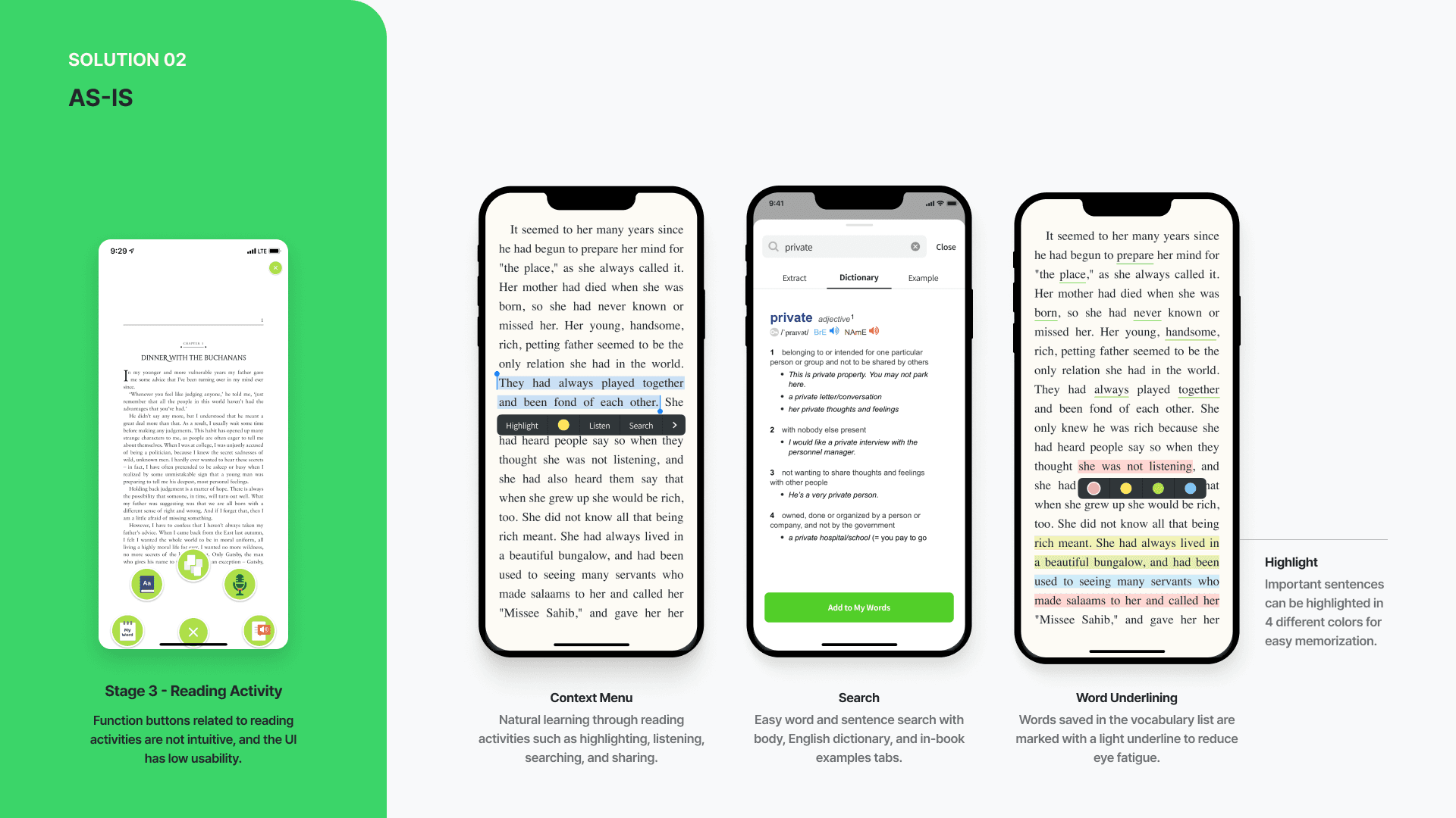 I improved the usability by enhancing the reading activities-related functions, allowing users to engage in natural learning through activities such as highlighting, sentence listening, and searching.