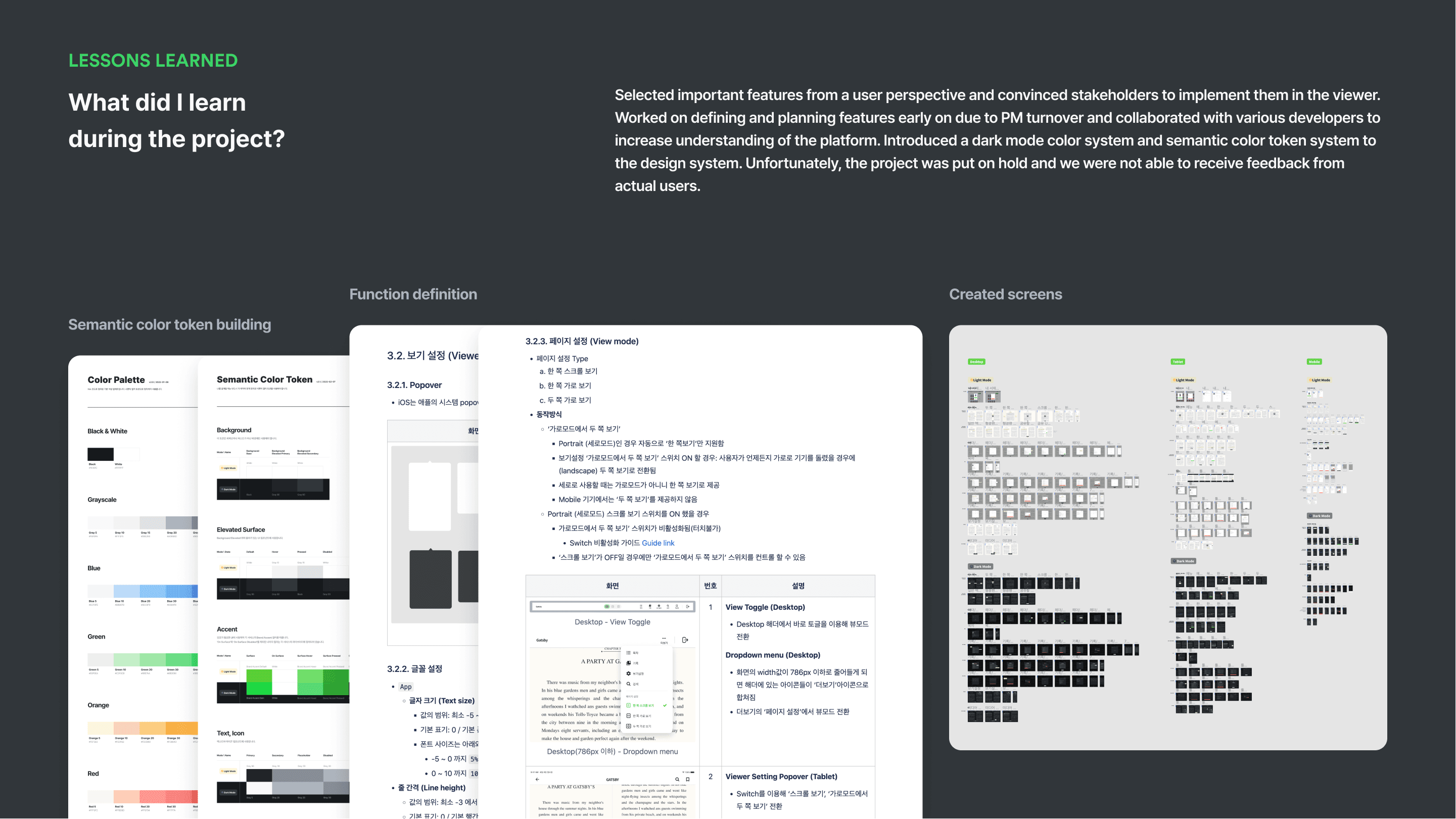 Starting with the theme switch in the Epub Viewer project, we introduced a dark mode color system and semantic color token system into the design system.