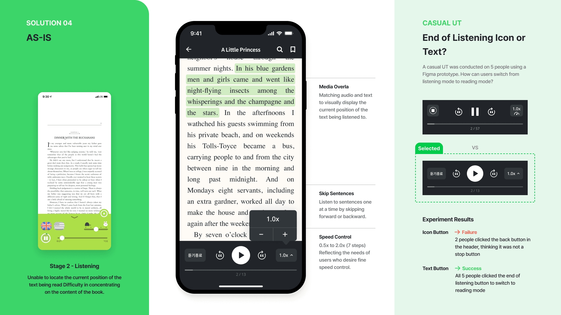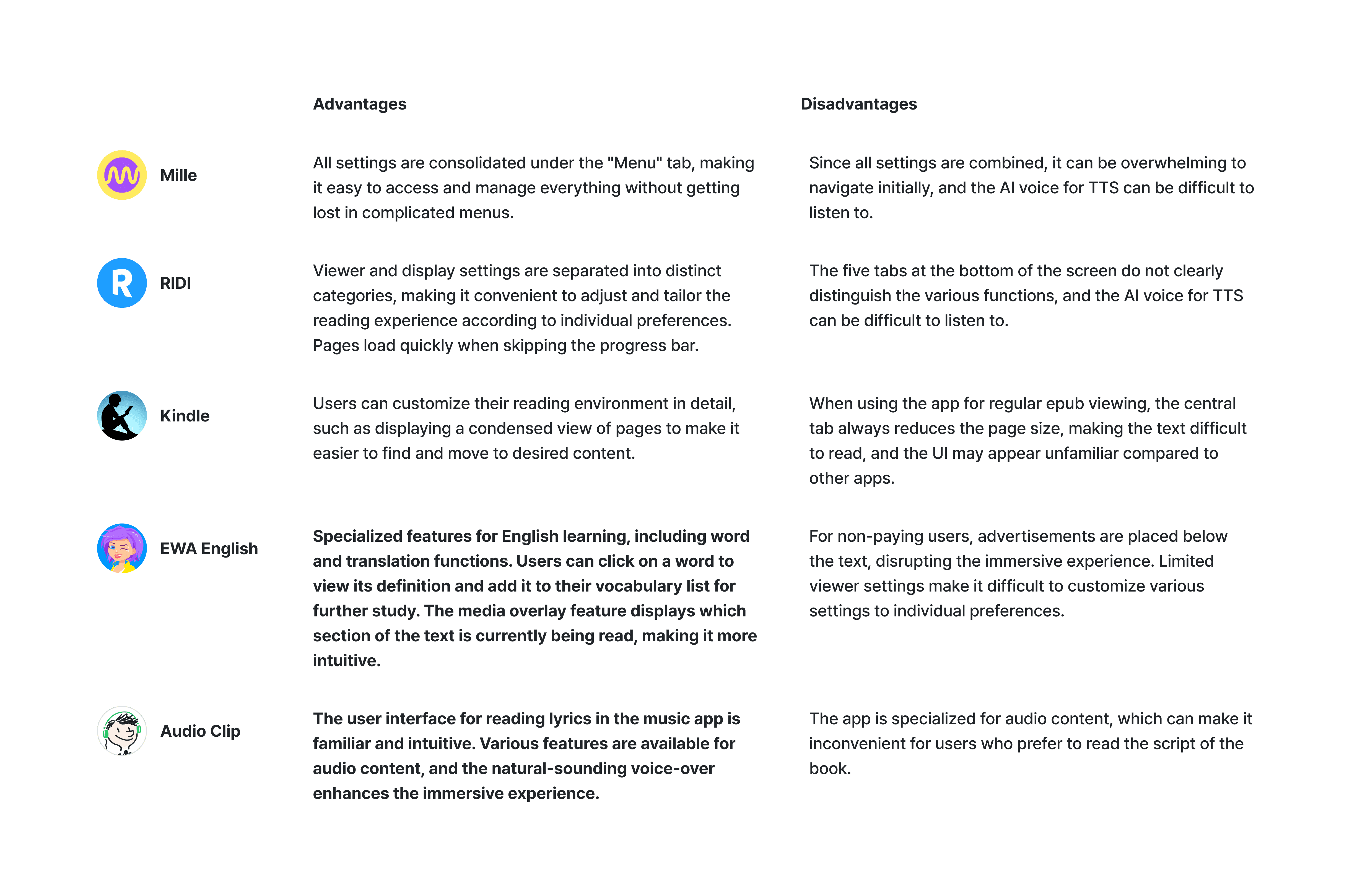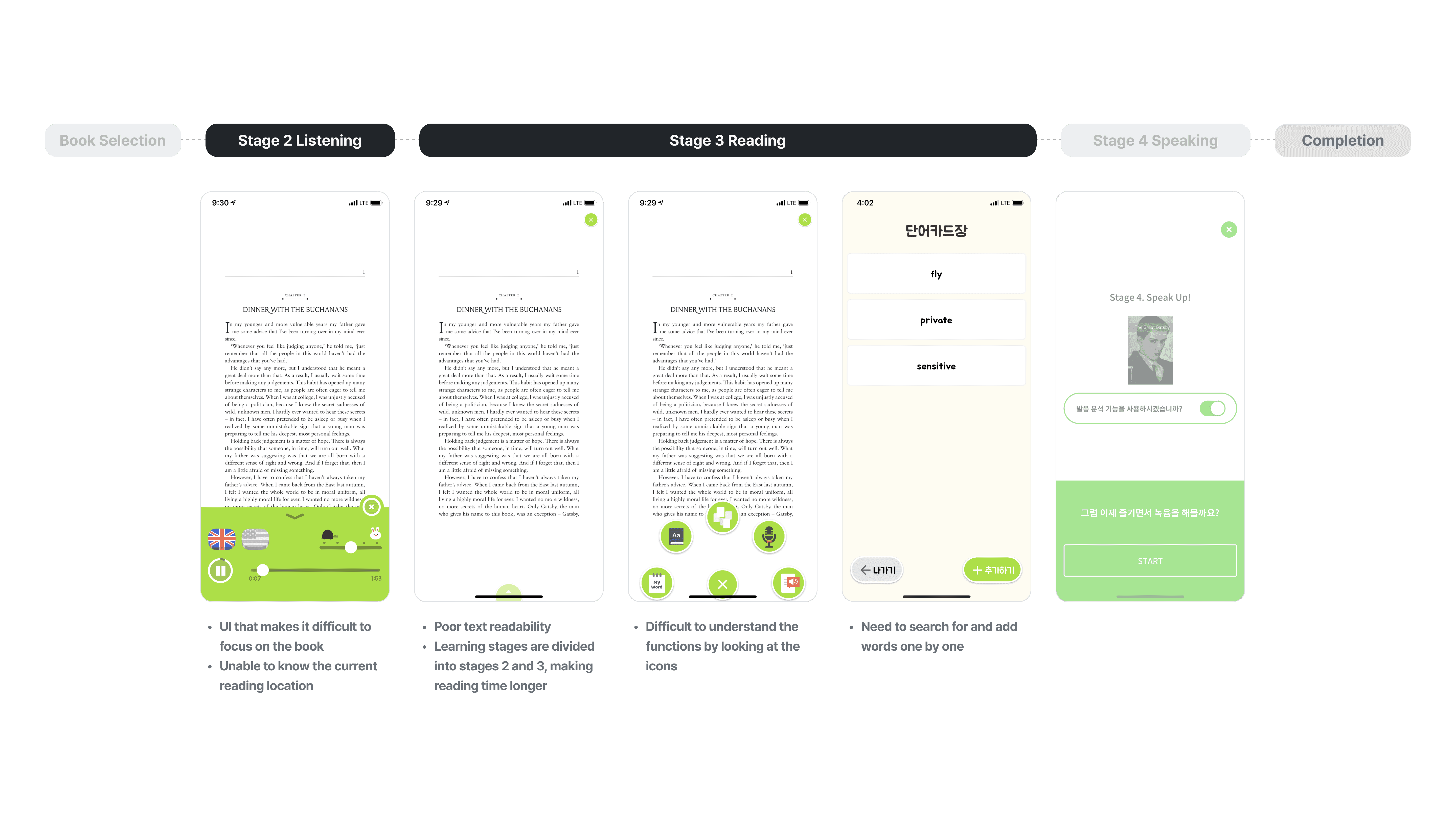 PDF viewer had issues with image-based operation, which made it inefficient for learning from text-heavy books. Its UI was designed for children, causing reduced concentration. Additionally, due to the learning stages tailored to picture books, users had to engage separately in reading and listening.