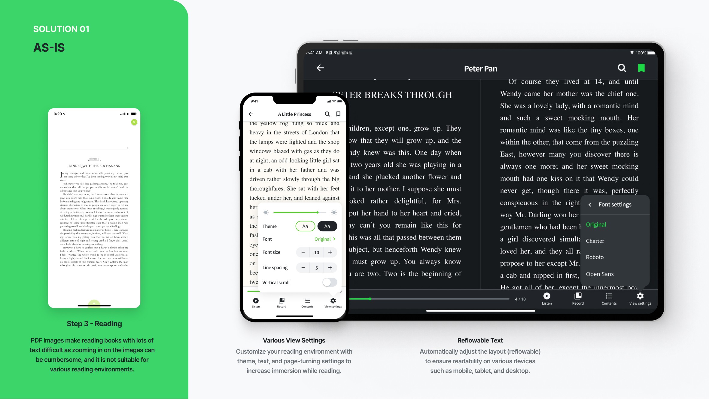 The previous Reading Stage 3 viewer for PDF files made it difficult to read books with a lot of text, but we have improved it by providing customized reading settings and the reflowable text feature to make it easy to read on various devices.