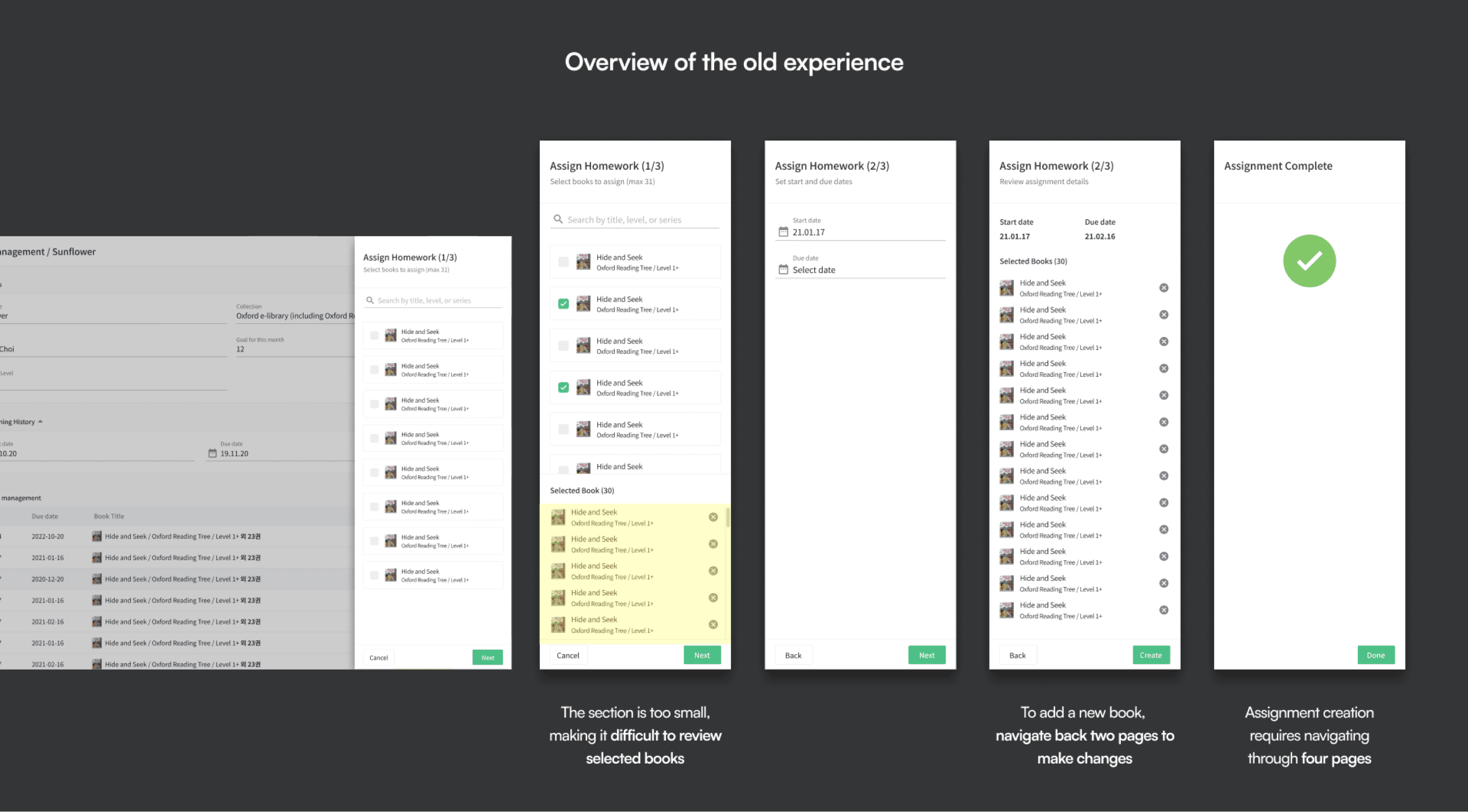 Editing assignment details (books, duration) required multiple steps and back-tracking